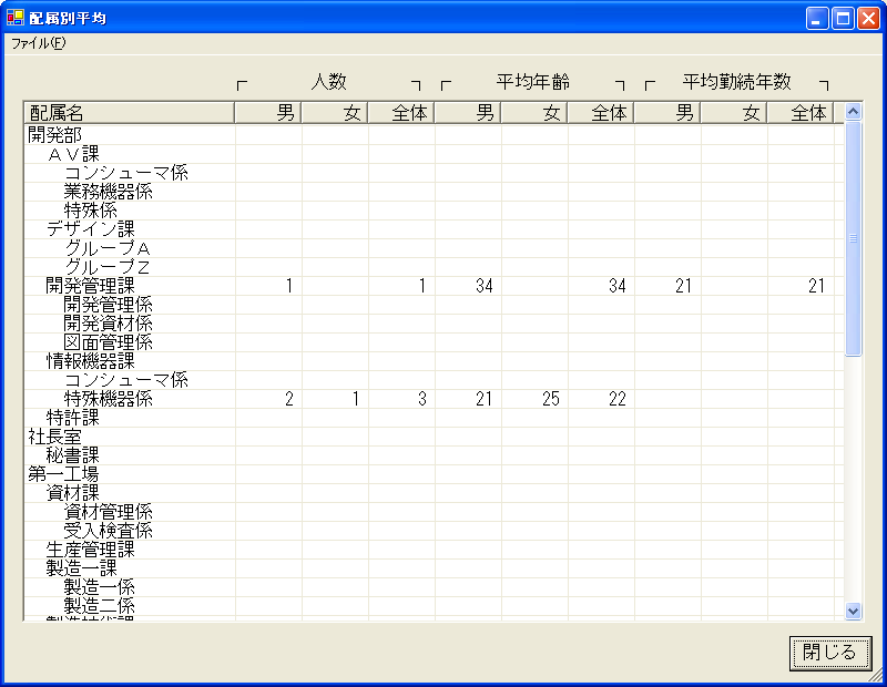 配属先別に人員の数、平均年齢、平均勤続年数を表にします。 印刷 既定のプリンタに印刷します。 CSV出力 CSV形式のテキストファイルとして書き出します。